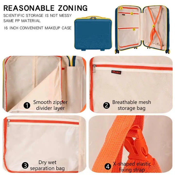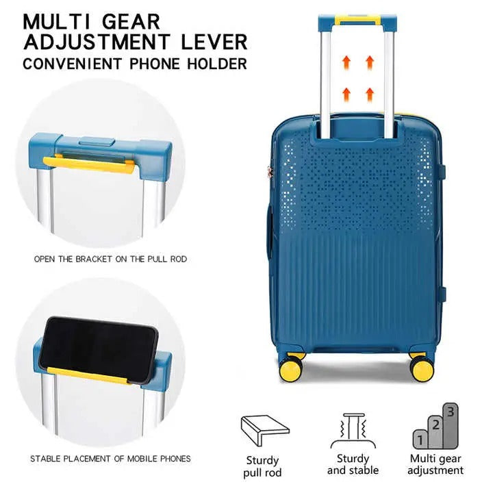 Each spinner size features an expandable zipper, smooth 360° spinner wheels, and a telescopic handle with an integrated phone holder—offering the perfect balance of function and flair. The beauty case adds extra storage for cosmetics or daily essentials and fits securely on your luggage with its rear trolley sleeve.