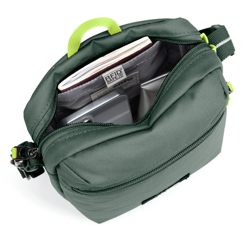 The Pacsafe Go Anti-Theft Festival Crossbody checks all the boxes for a must-have crossbody bag, whether it's for exploring a new city, dancing at a music festival, or café hopping in town. With two spacious compartments for easy organization, this bag can easily store a phone, wallet, portable charger, headphones, eBook reader, and more. Enjoy every moment without having to worry about your valuables as this crossbody features the hassle-free Dock Lock anti-theft feature, a cut-resistant strap, RFID-Blocking pocket and more. This product is made with post-consumer recycled polyester (rPET), equivalent to 6 recycled plastic bottles.