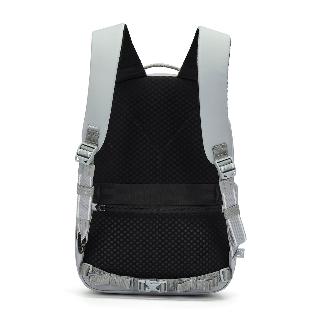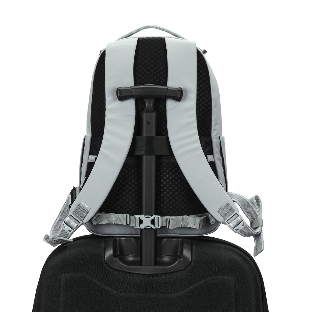 Compact yet highly organized, this 16L anti-theft backpack is designed to securely carry your day trip essentials. It features two lockable compartments, each equipped with internal organization pockets to ensure everything stays neatly arranged. Additionally, the backpack includes a padded laptop sleeve designed to accommodate a 13" MacBook, providing extra protection for your device. For added convenience, the backpack includes a hidden pocket on the back to safely store important items such as your phone, providing easy access whenever needed. It also features a luggage slip, allowing you to securely attach the backpack to the handle of your wheeled luggage.