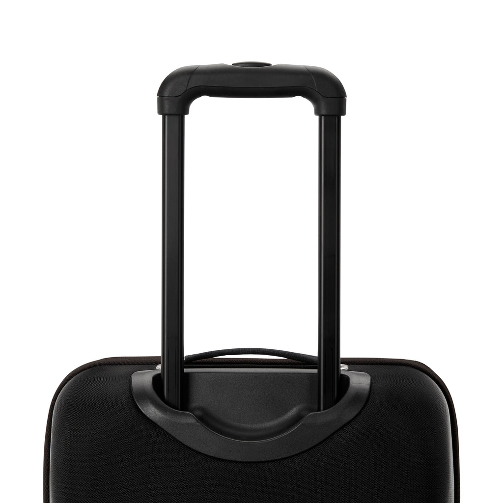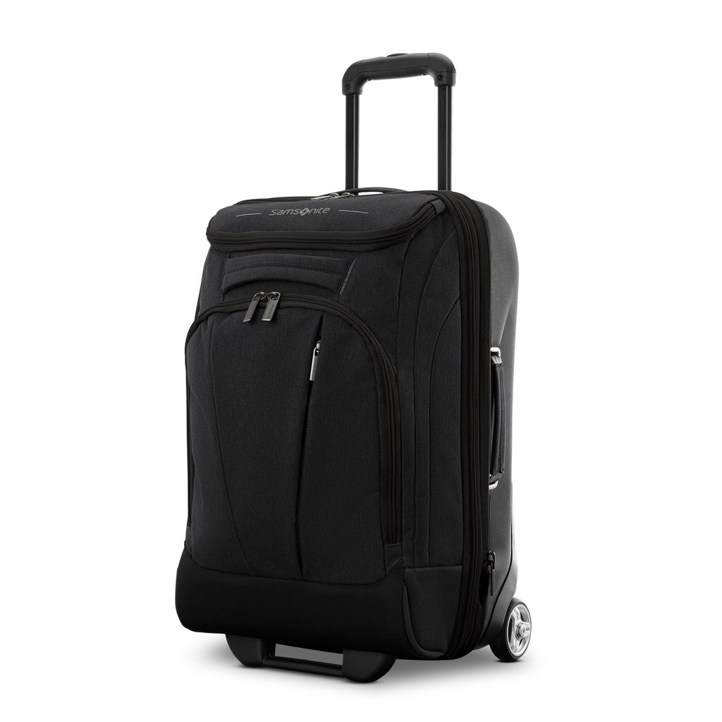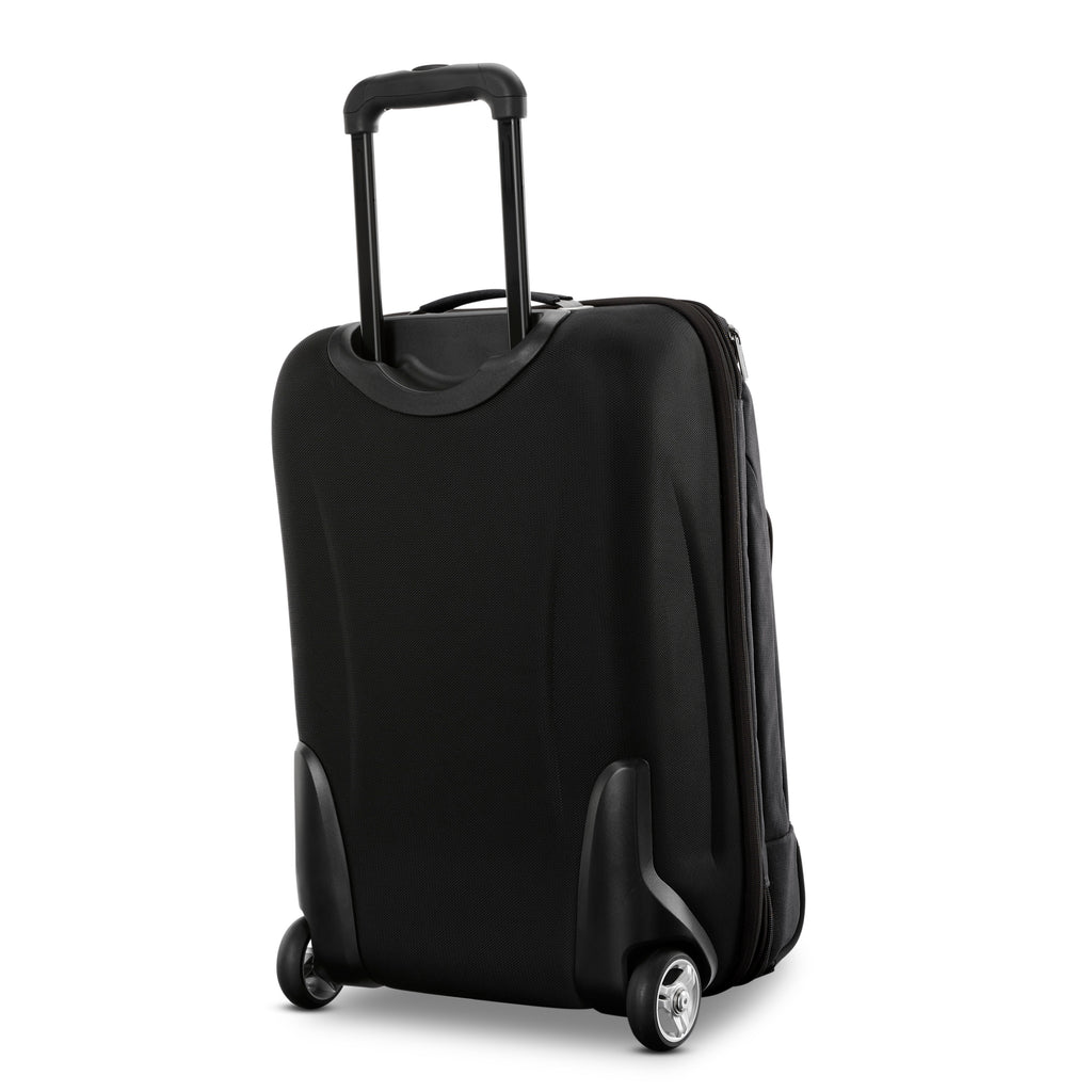 - Hybrid design with solid hardside back and softside front